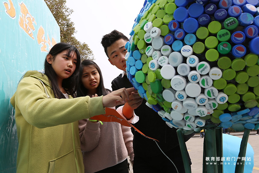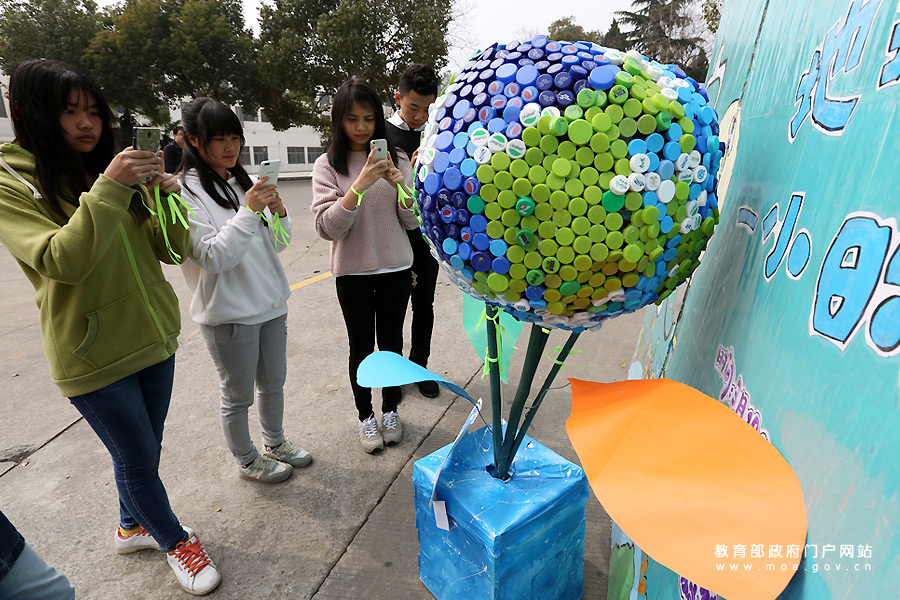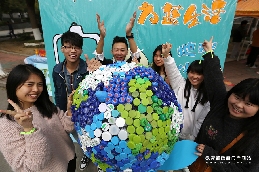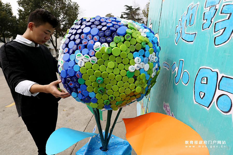 響應(yīng)“地球一小時(shí)” 大學(xué)生用2016個(gè)瓶蓋搭地球模型