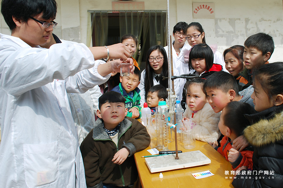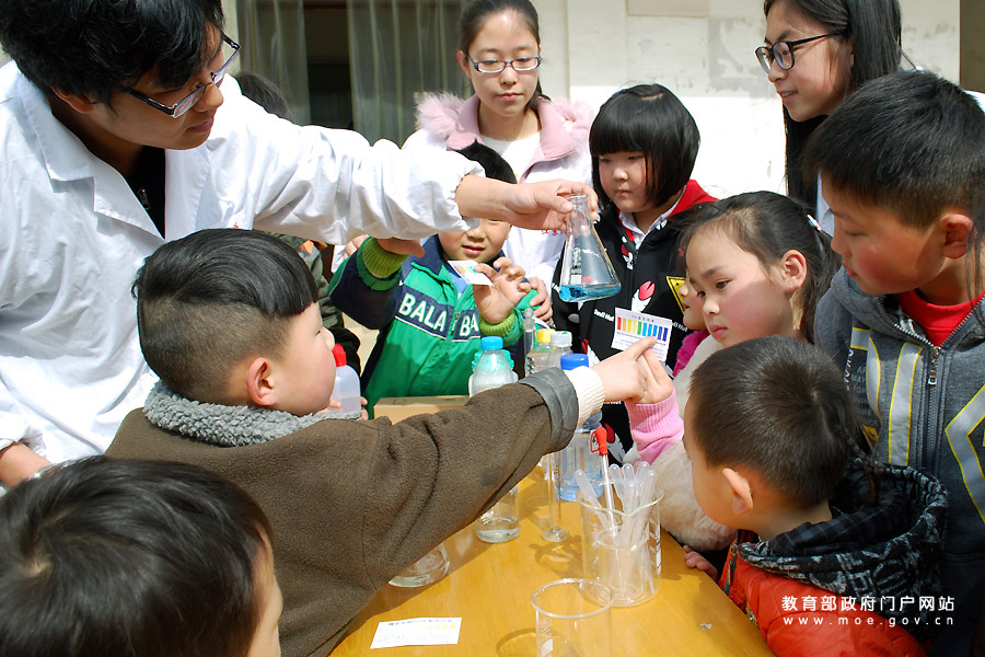 志愿者在為小朋友演示水硬度檢測實驗。(石玉成 方孫飛/攝)