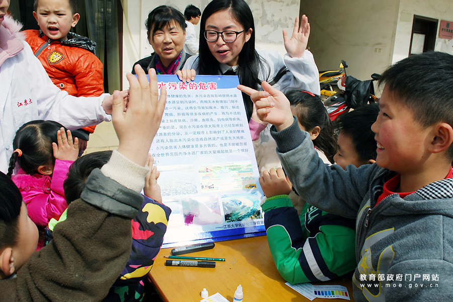 志愿者在向小朋友宣講水污染的危害。(石玉成 方孫飛/攝)