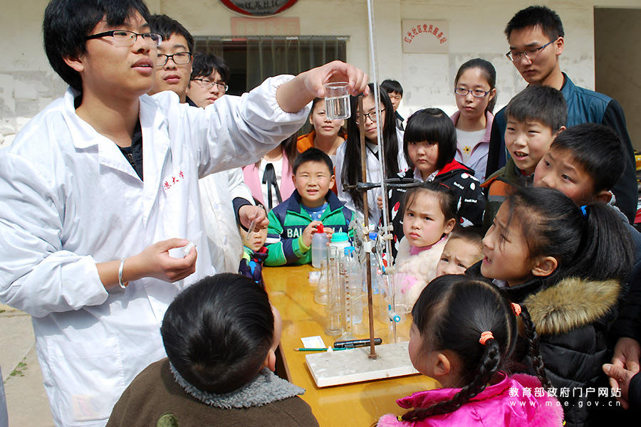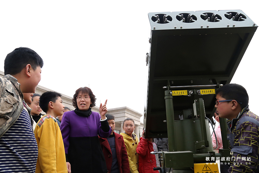 河南省溫縣氣象局工作人員為小學(xué)生講解人工增雨的原理。(徐宏星/攝)