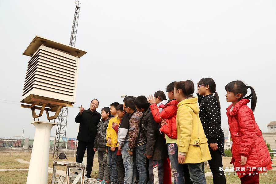 河南省溫縣氣象局工作人員為小學(xué)生介紹氣象儀器的作用。(徐宏星/攝)