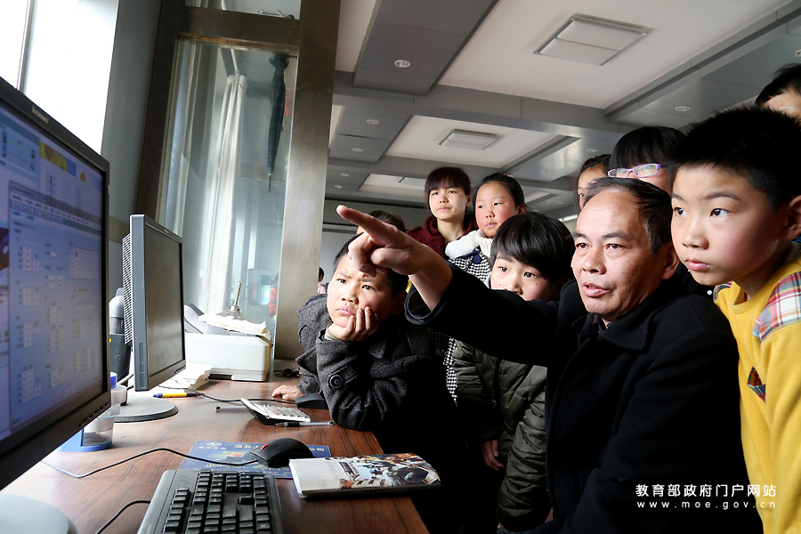 河南省溫縣氣象局工作人員為小學(xué)生介紹天氣預(yù)報的制作過程。(徐宏星/攝)