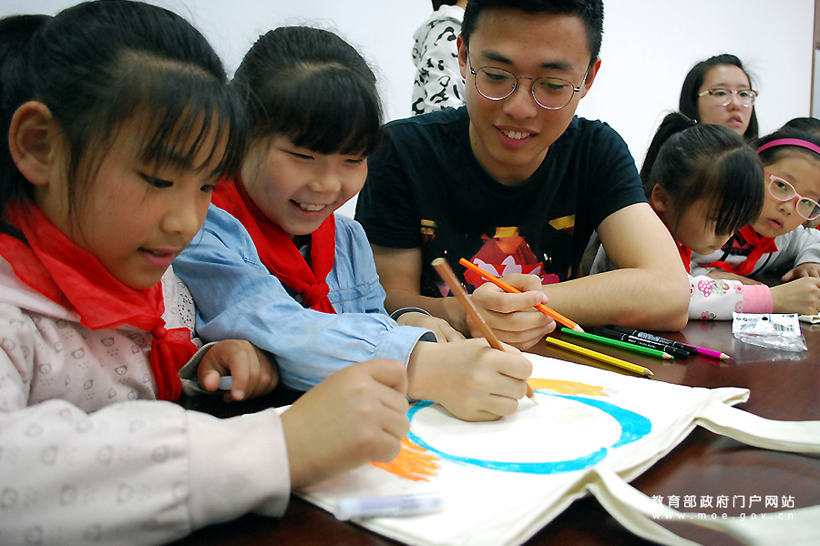 志愿者在指導小朋友涂鴉環(huán)保布袋。(石玉成 張冬冬/攝)