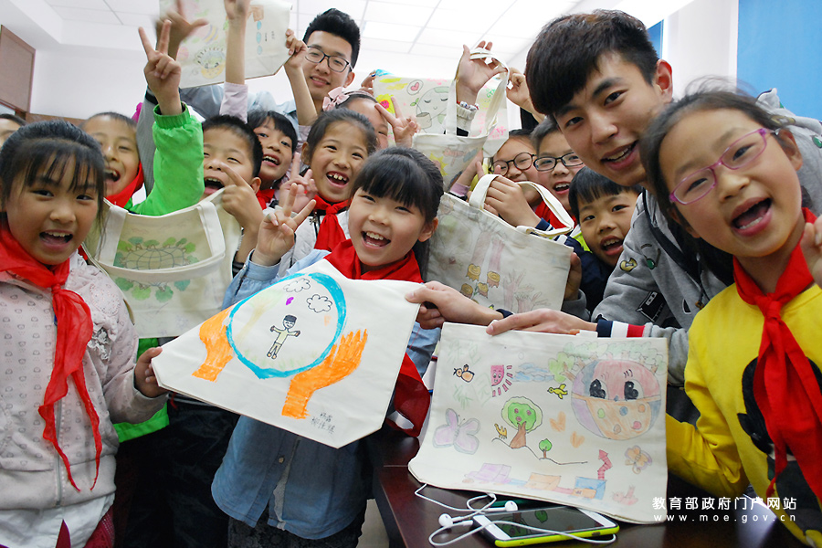 小朋友和志愿者在展示涂鴉了環(huán)保畫的環(huán)保布袋。(石玉成 張冬冬/攝)