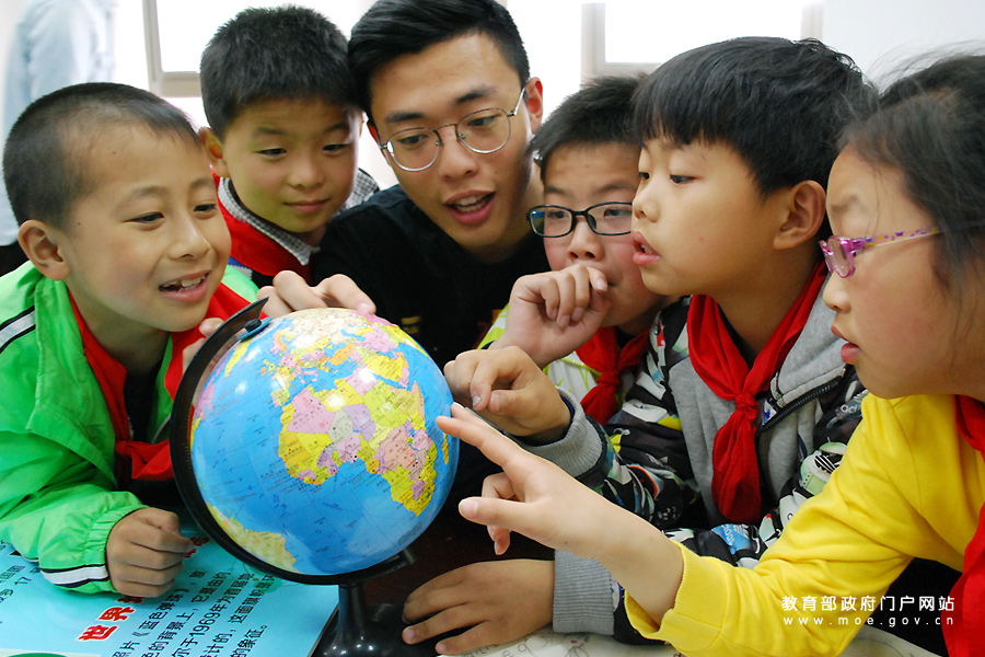 志愿者通過地球儀為小朋友講解環(huán)保知識。(石玉成 張冬冬/攝)