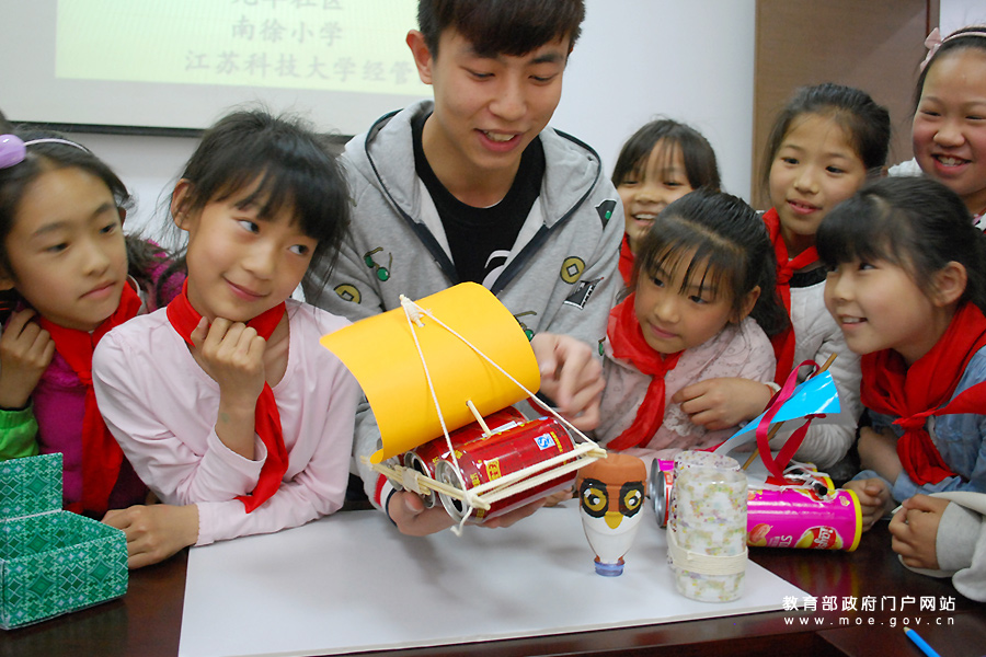 志愿者為小朋友講解環(huán)保工藝品的制作方法。(石玉成 張冬冬/攝)