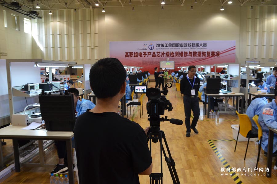 1/0電子產(chǎn)品芯片級(jí)檢測維修與數(shù)據(jù)恢復(fù)現(xiàn)場,媒體記者進(jìn)行賽況直播。(岱宗/攝 李娜/文)
