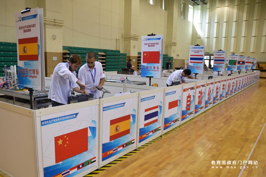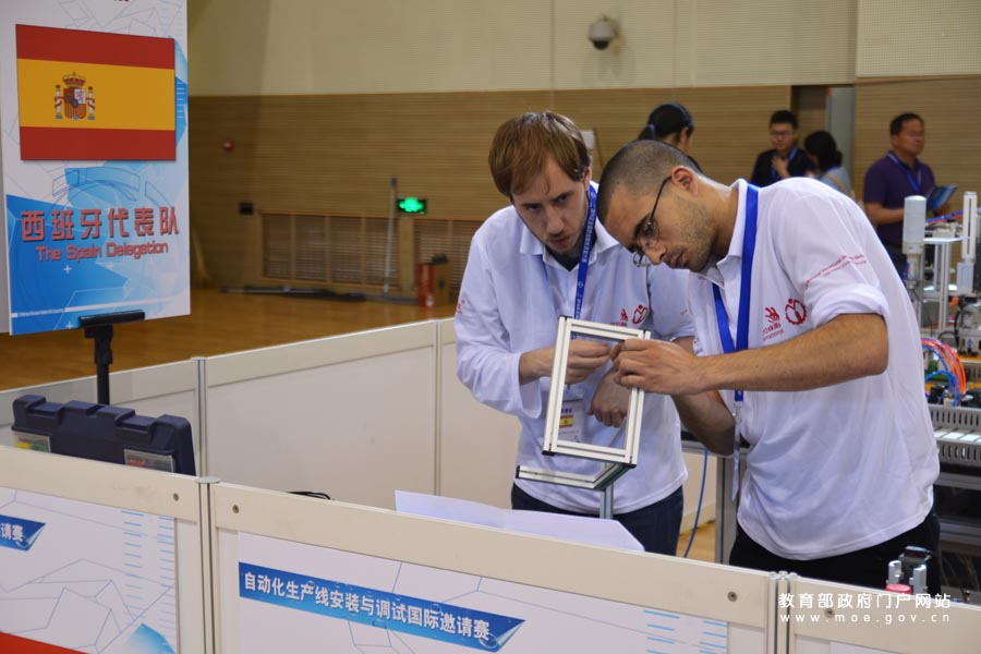 1/0自動(dòng)化生產(chǎn)線安裝與調(diào)試國際邀請(qǐng)賽區(qū),西班牙代表隊(duì)選手默契配合。(岱宗/攝 李娜/文)
