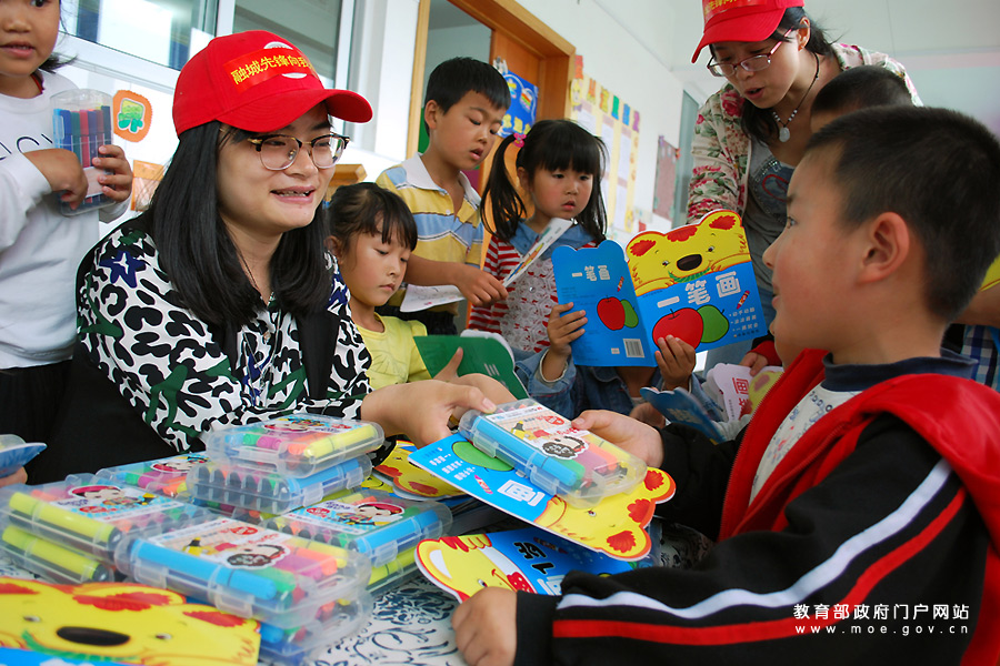 1/0志愿者向外來(lái)務(wù)工人員子女贈(zèng)送學(xué)習(xí)用品。(石玉成/攝)