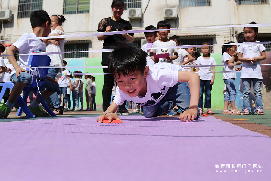 幼兒園的小朋友在做游戲?!傲弧眱和?jié)即將來臨之際,河南省溫縣實驗幼兒園舉行“親子運動迎六一”主題活動,家長和孩子們一起參與多種運動游戲,共享運動樂趣。(徐宏星/攝)