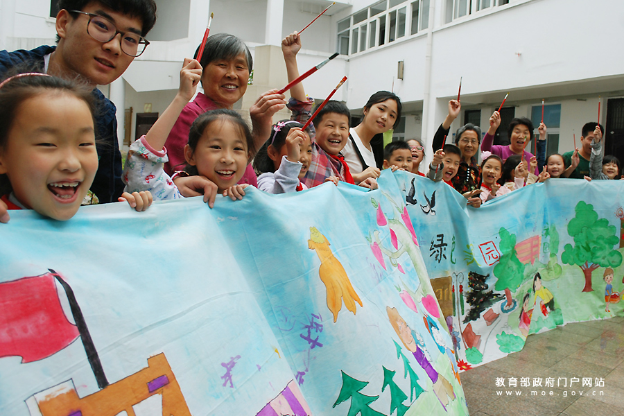 志愿者和小學(xué)生一起展示描畫的綠色家園長卷。(石玉成 周德帥/攝)