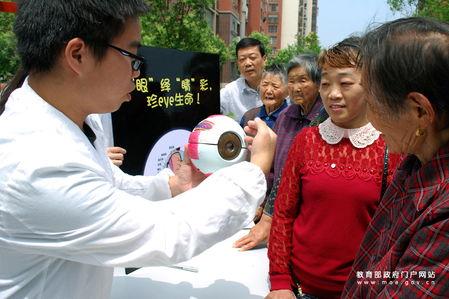 志愿者通過眼球結(jié)構(gòu)模型向居民宣講科學(xué)護(hù)眼知識。(石玉成 陶文杰/攝)