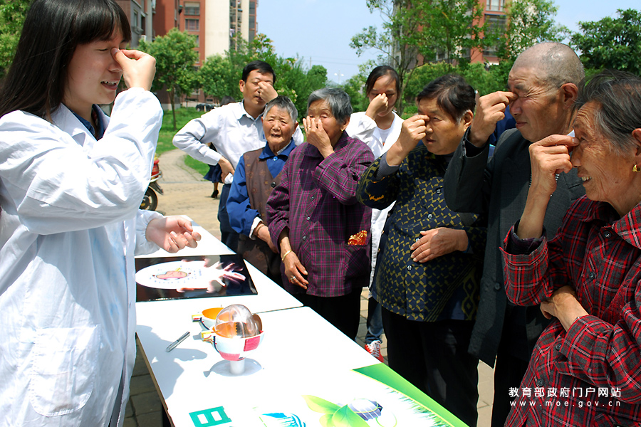 江蘇大學(xué)醫(yī)學(xué)院志愿者來到鎮(zhèn)江市和平路街道征潤州社區(qū),開展“愛眼護(hù)眼從我做起”活動,為居民宣講愛眼、護(hù)眼和用眼等健康科普知識,增強(qiáng)居民的科學(xué)護(hù)眼意識,迎接6月6日全國“愛眼日”的到來。(石玉成 陶文杰/攝)