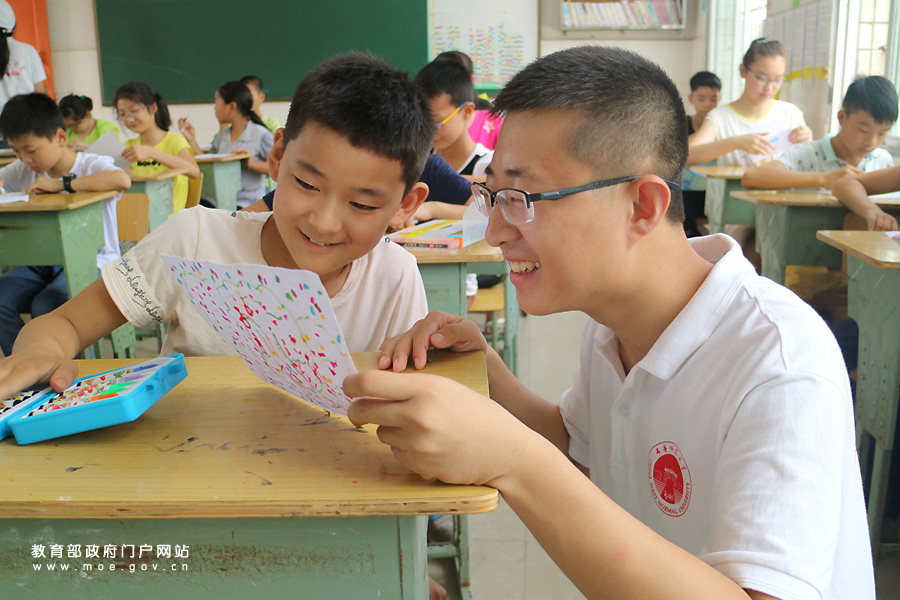 國獎學子教留守孩子學習粉筆字。近日,由西華師范大學20名國家獎學金獲得者組成的支教團,赴該校精準扶貧工作重點幫扶單位四川省閬中市西山鄉(xiāng),組織開展了豐富多彩的趣味教學和科普活動,讓當?shù)亓羰貎和冗^了一個愉快的假期。