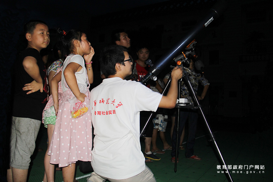 夜幕下,孩子們圍在天文望遠鏡旁,爭先恐后地觀察月亮。