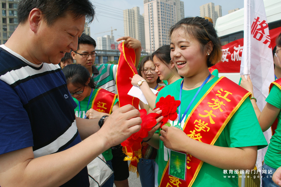 前來送行的老師為支教的志愿者戴上綬帶和光榮花。(石玉成 丁永萍/攝)
