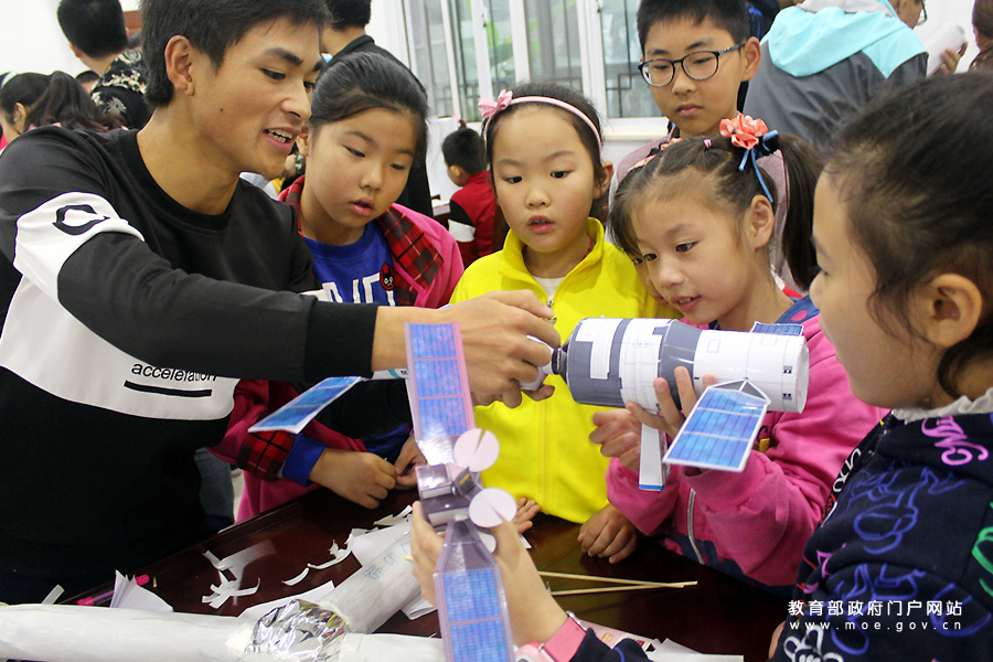 志愿者在為小學(xué)生講解水稻的生長過程。(石玉成 譚海波/攝)