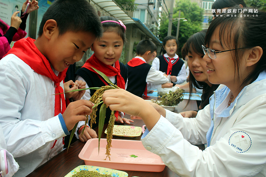 志愿者在為小學(xué)生講解五谷雜糧的功用。(石玉成 譚海波/攝)