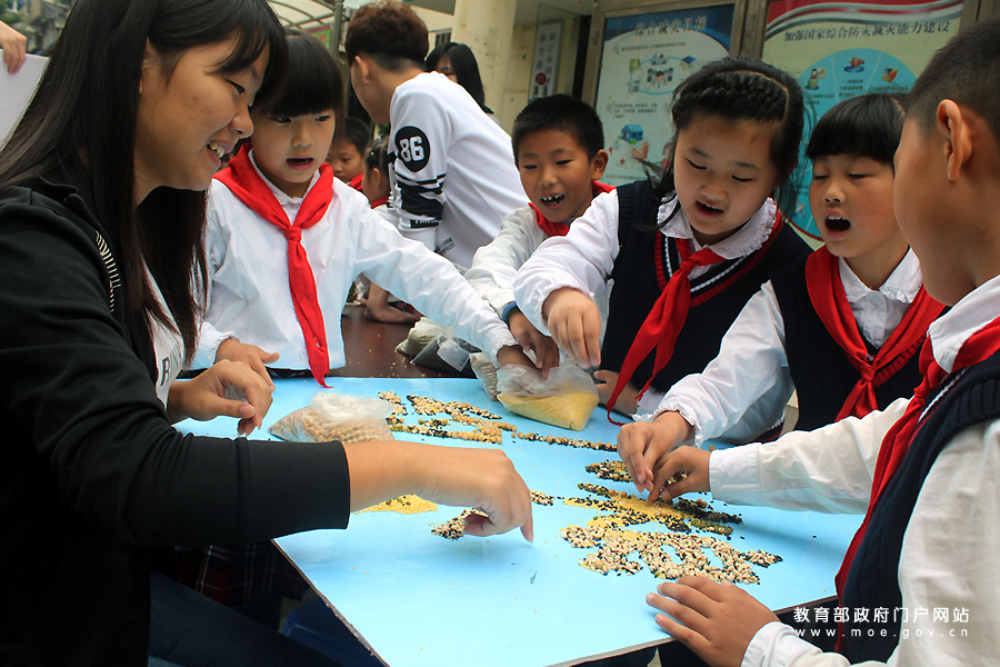 近日,江蘇科技大學(xué)志愿者走進(jìn)鎮(zhèn)江市和平路街道金山社區(qū),指導(dǎo)轄區(qū)金山小學(xué)的學(xué)生認(rèn)識五谷雜糧,了解其生產(chǎn)過程和功用,并用五谷雜糧拼出“節(jié)約糧食”宣傳牌,增強(qiáng)孩子們愛惜糧食從小做起的意識。(石玉成 譚海波/攝)