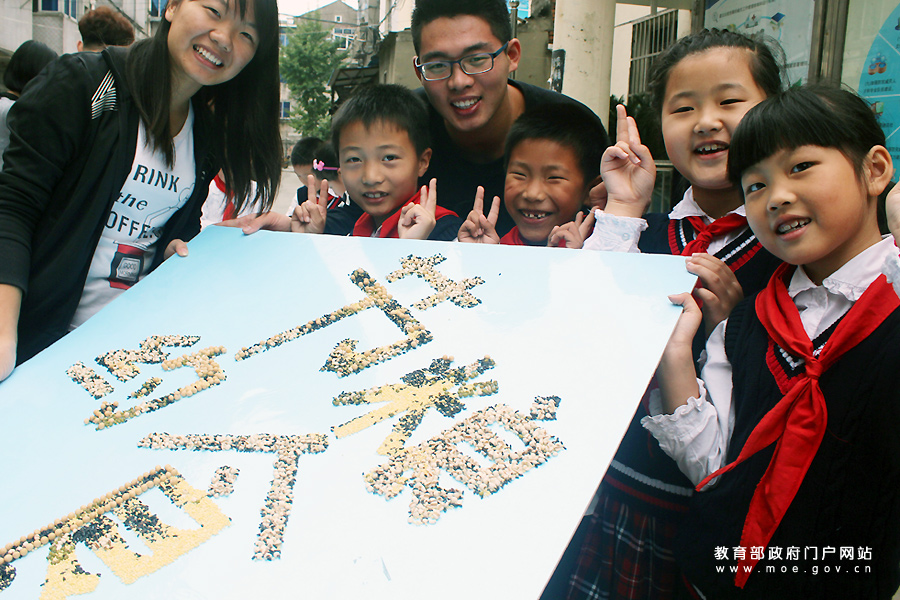 志愿者與小學(xué)生在展示用五谷雜糧拼出的“節(jié)約糧食”宣傳牌。(石玉成 譚海波/攝)