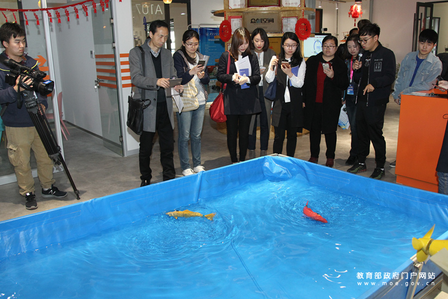1/0采訪團(tuán)在觀看機(jī)器魚(yú)在水中游動(dòng)。(于淼/文 樊世剛/攝)