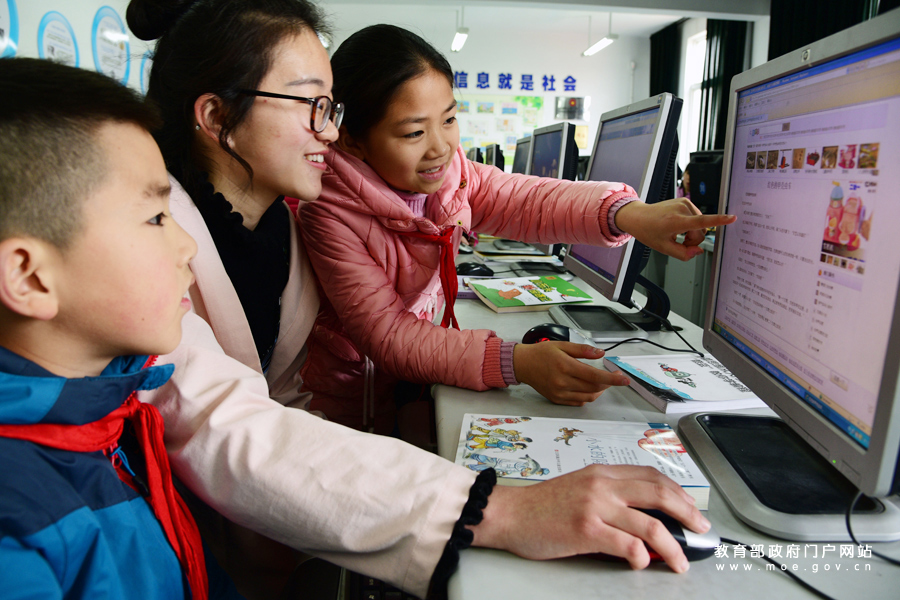 志愿者在指導(dǎo)小朋友網(wǎng)上讀書。(石玉成 肖怡晨/攝)
