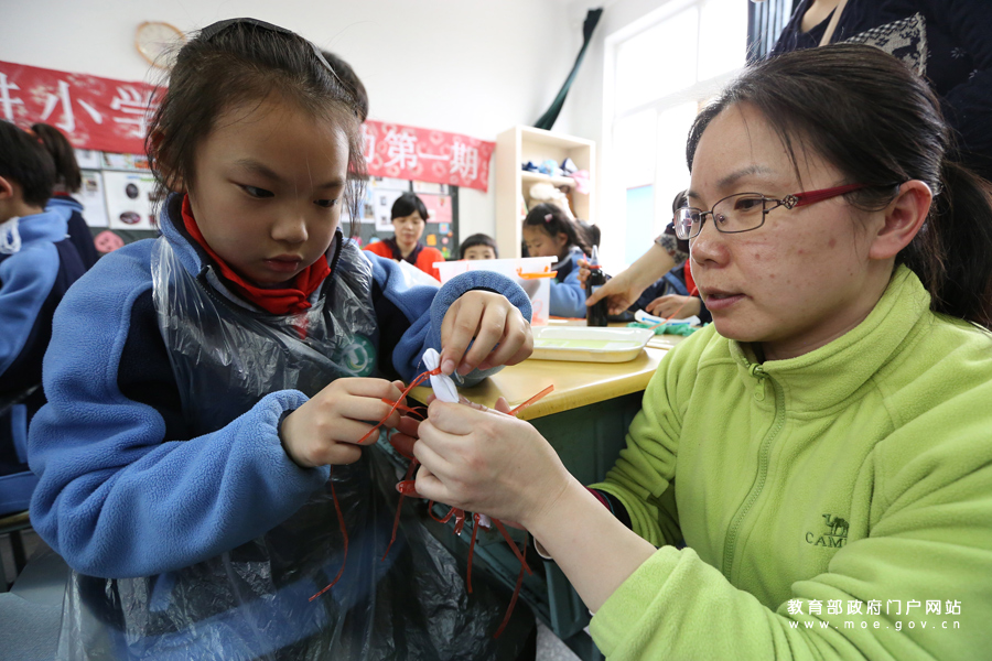 大學(xué)生在指導(dǎo)小學(xué)生學(xué)習制作扎染。(楊雨/攝)