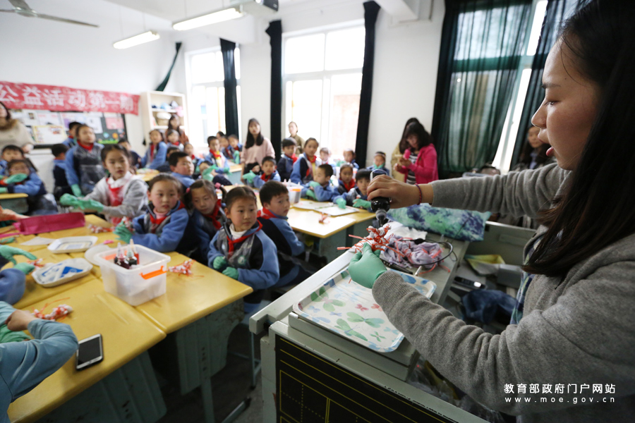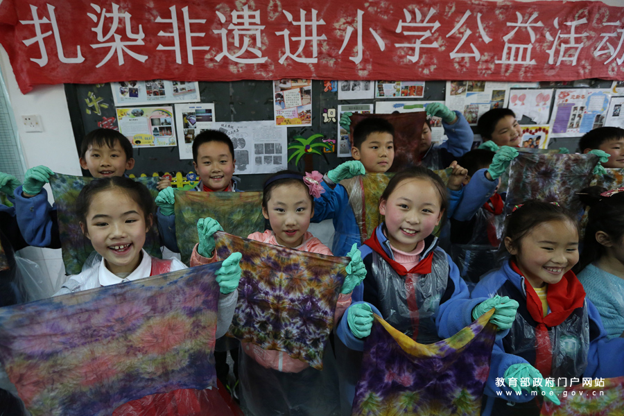 江蘇大學(xué)開展“扎染非遺進小學(xué)”公益活動。該校大學(xué)生走進江蘇大學(xué)附屬小學(xué),向小學(xué)生們介紹“扎染”的歷史和知識,并指導(dǎo)他們制作,讓他們在學(xué)習和動手中感受傳統(tǒng)文化的魅力。(楊雨/攝)