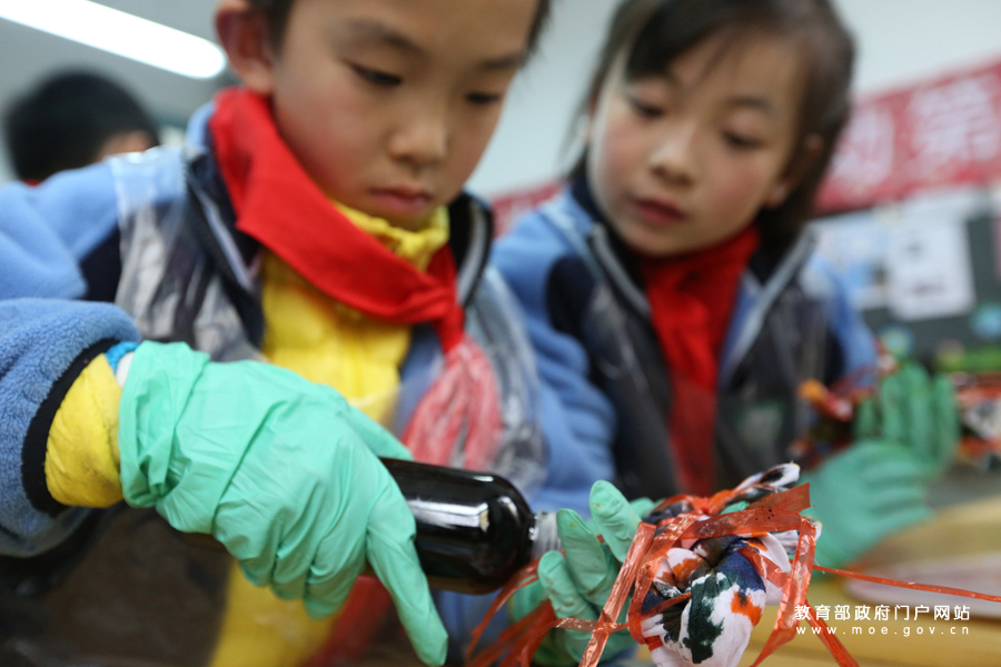 兩名小學(xué)生在對自己的扎染作品進行染色。(楊雨/攝)
