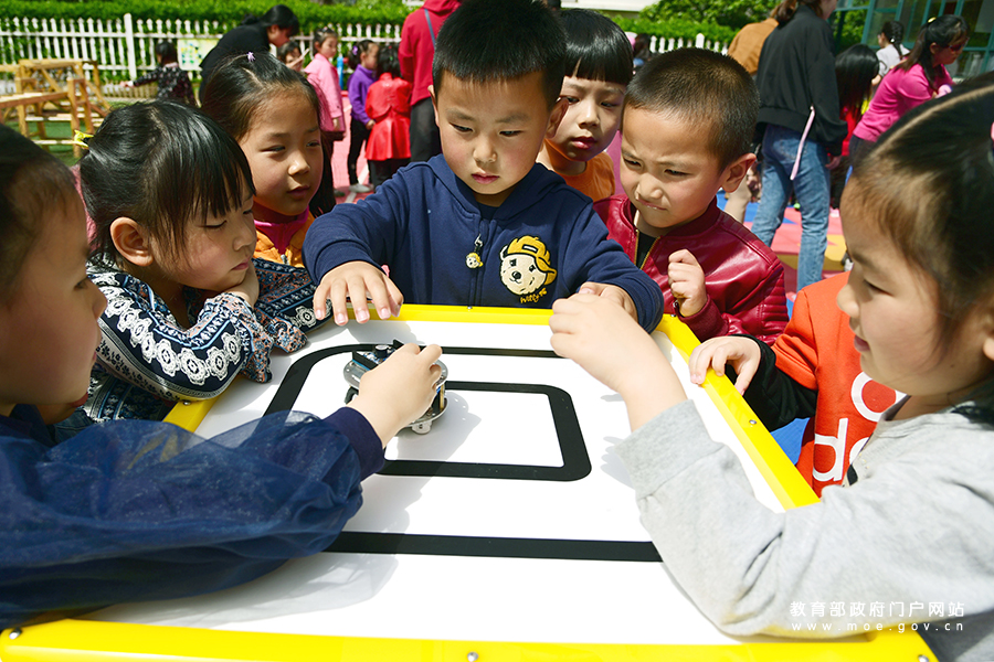 小朋友在玩科普游戲——“循跡小車”。(石玉成 姚利林/攝)
