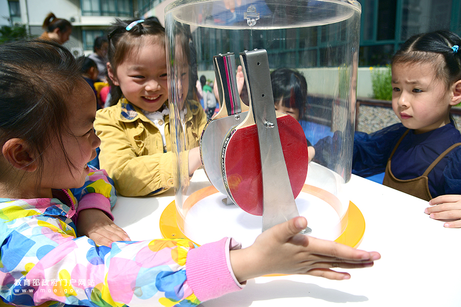 小朋友在玩科普游戲——“靜電乒乓”。(石玉成 姚利林/攝)