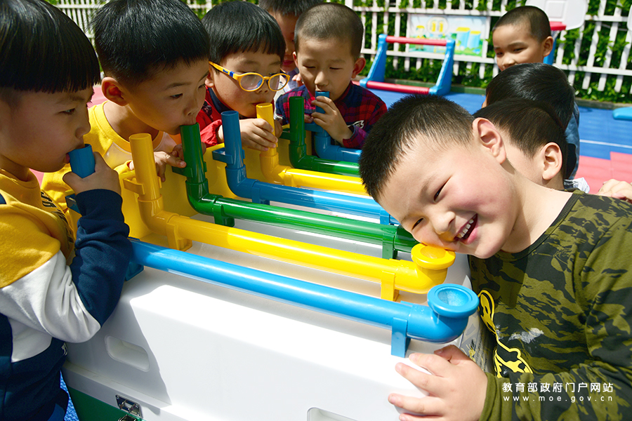 小朋友在玩科普游戲——“空中排簫”。(石玉成 姚利林/攝)