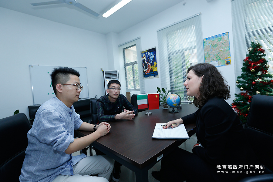 福州大學(xué)“中意交流中心”意大利籍執(zhí)行主管Carmen用流利的中文和赴羅馬留學(xué)歸來的博士生溝通交流。(張勁松/攝 李娜/文)
