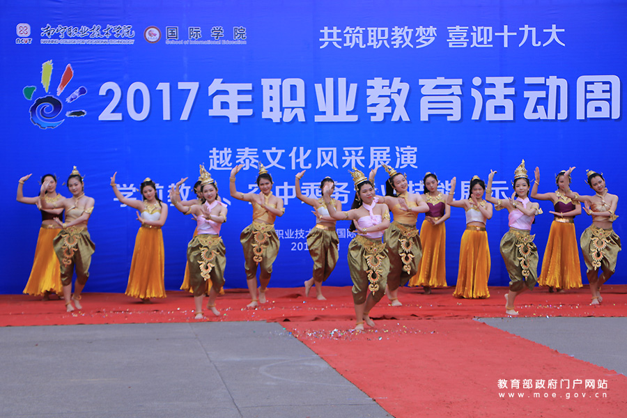 南寧職業(yè)技術(shù)學(xué)院越南語專業(yè)學(xué)生通過舞蹈展示越南民族服飾。(馮星源/攝)