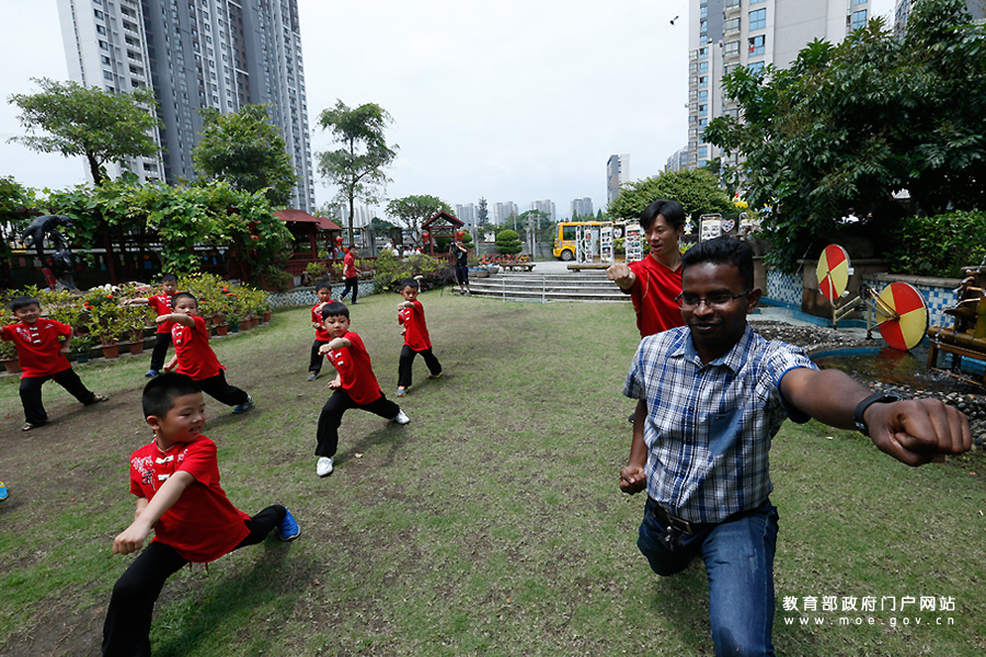 巴基斯坦留學(xué)生、小朋友一起跟老師學(xué)武術(shù)。(張勁松/攝 李娜/文)