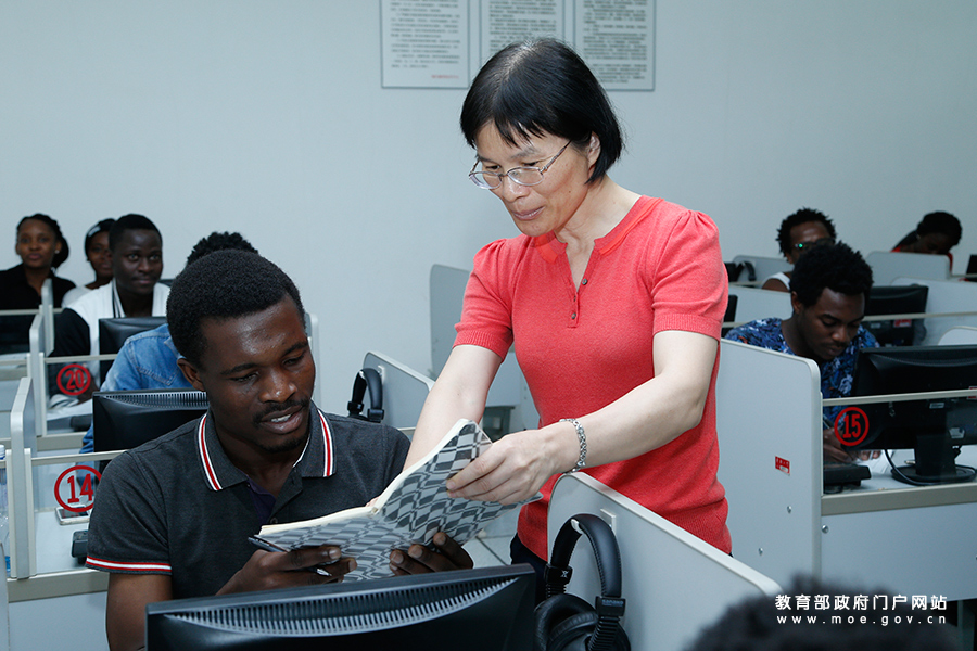 華僑大學(xué)中文老師正在指導(dǎo)安哥拉學(xué)生中文發(fā)音。(張勁松/攝 李娜/文)
