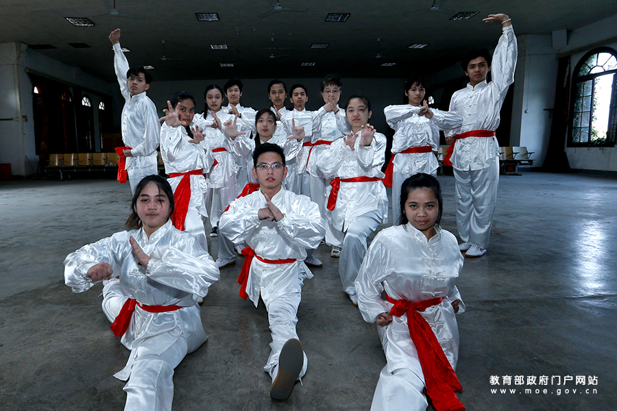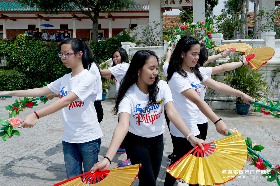 菲律賓留學(xué)生表演當(dāng)?shù)靥厣璧?。(張勁?攝 李娜/文)