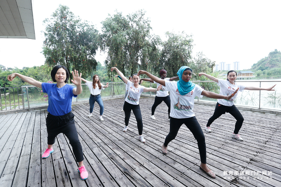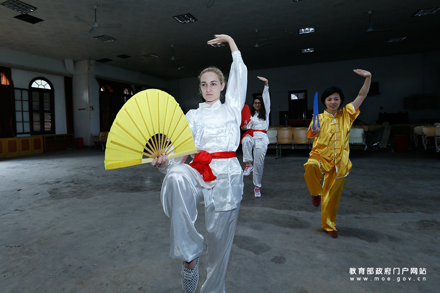 福建師范大學(xué)“一帶一路”沿線國家的留學(xué)生表演太極拳,一招一式頗有專業(yè)風(fēng)范。為迎接黨的十九大,教育部新聞辦組織中央媒體采訪團(tuán)深入地方,用圖文記錄十八大以來教育改革發(fā)展的新進(jìn)展。5月16日至18日,采訪團(tuán)一行走進(jìn)福州大學(xué)、廈門大學(xué)等七所高校,圍繞“一帶一路”沿線國家留學(xué)生學(xué)習(xí)漢語和中華文化相關(guān)情況進(jìn)行采訪報(bào)道,更好的展現(xiàn)“一帶一路”中的文化傳承。(張勁松/攝 李娜/文)