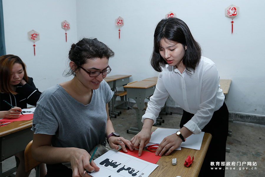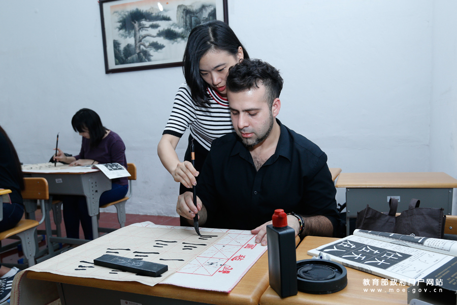 福建師范大學(xué)教師指導(dǎo)留學(xué)生學(xué)習(xí)書法。(張勁松/攝 李娜/文)