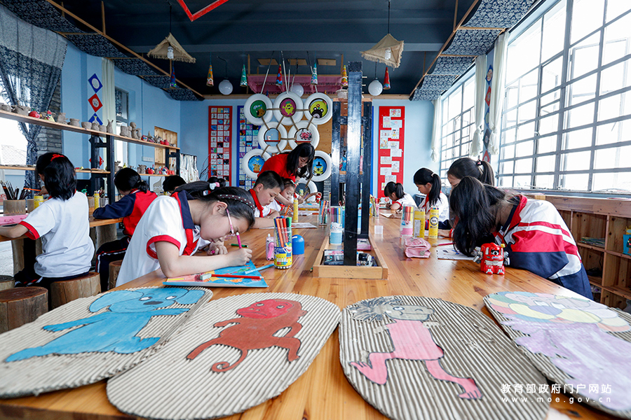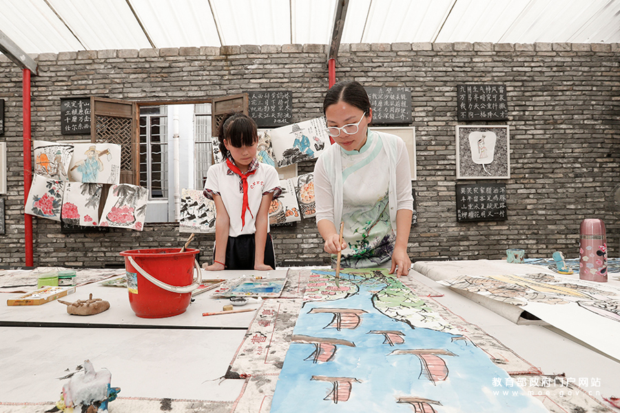 潭北小學(xué)少年宮國畫社團(tuán)的老師在農(nóng)學(xué)書院內(nèi)指導(dǎo)學(xué)生繪制國畫。(張勁松/攝 趙奕/文)