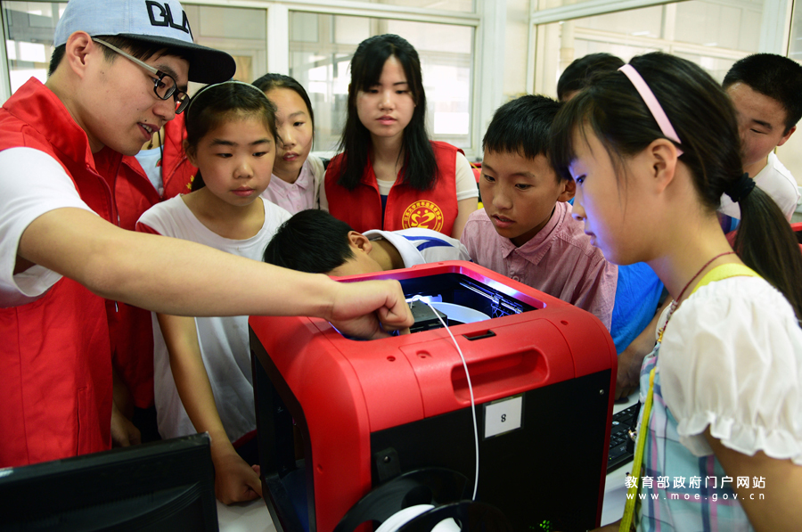 志愿者在為留守兒童講解3D打印機(jī)的功能。(石玉成 杜康/攝)