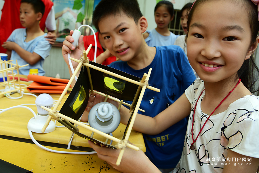 1/0小朋友在展示制作的創(chuàng)意節(jié)能臺(tái)燈。(石玉成 肖怡晨/攝)
