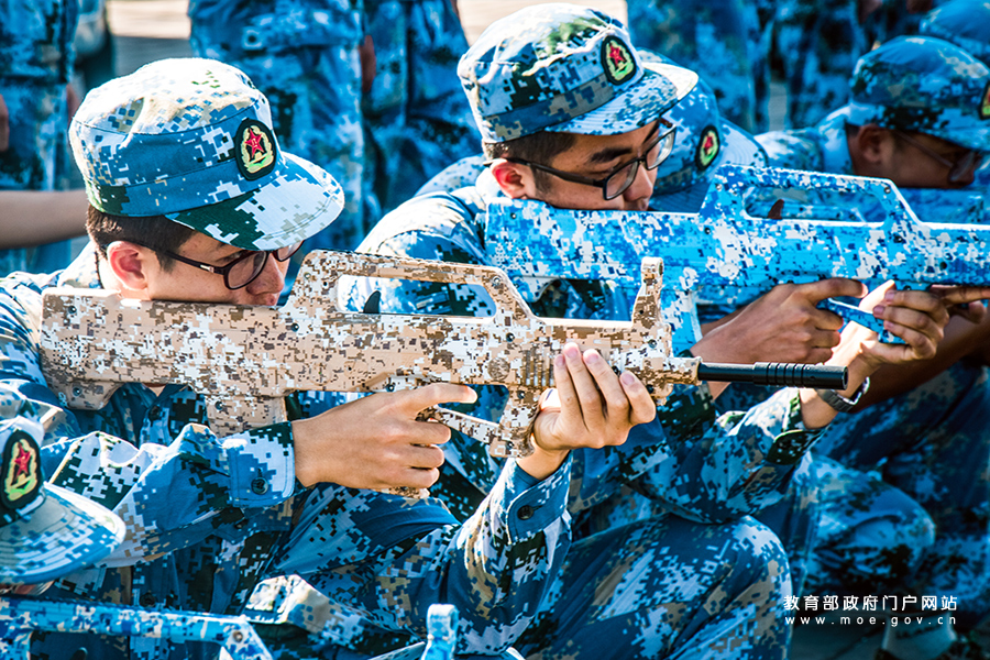 1/0“精神集中,目光篤定”——北京大學軍訓團模擬打靶。(程佳路/攝)