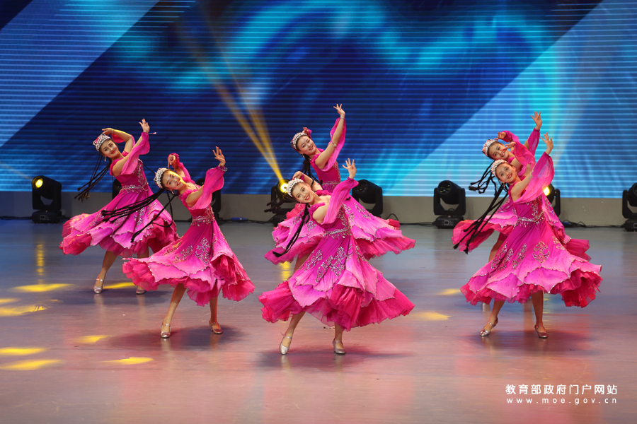 新疆維吾爾自治區(qū)學(xué)生代表以20秒舞蹈演出的方式展現(xiàn)自治區(qū)文化特色。(上海教育報刊總社記者 陸嘉輝/攝 李佩 姚振/文)