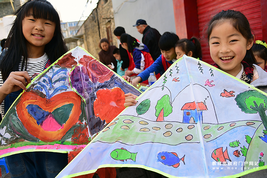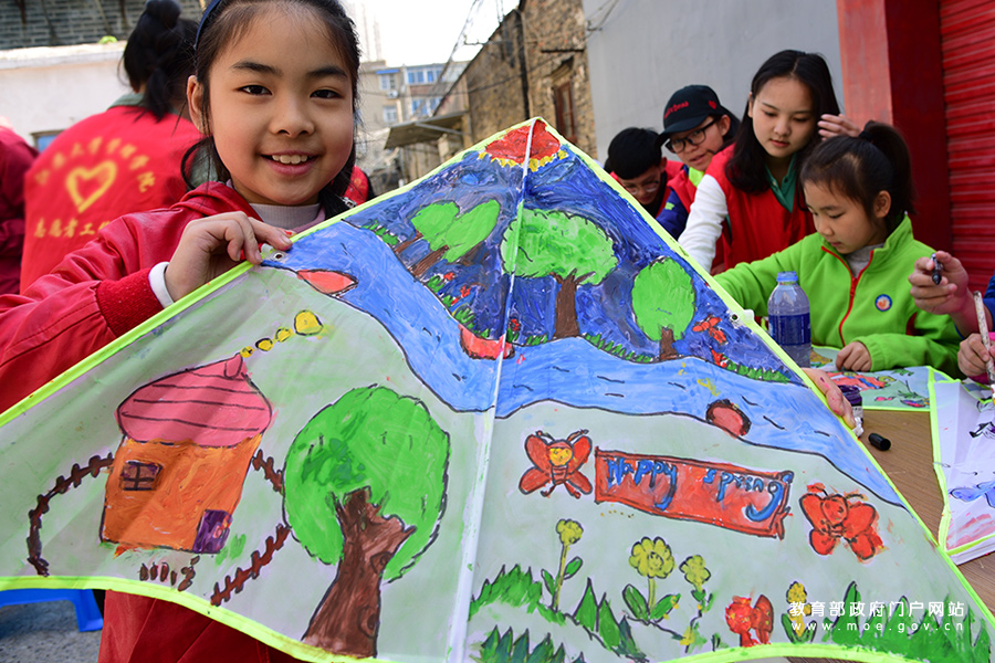 小朋友在展示描畫好的風(fēng)箏。(石玉成 周存君/攝)