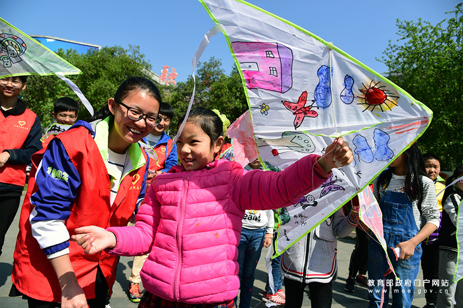 江蘇大學(xué)志愿者和小朋友準(zhǔn)備放飛手繪風(fēng)箏。(石玉成 周存君/攝)