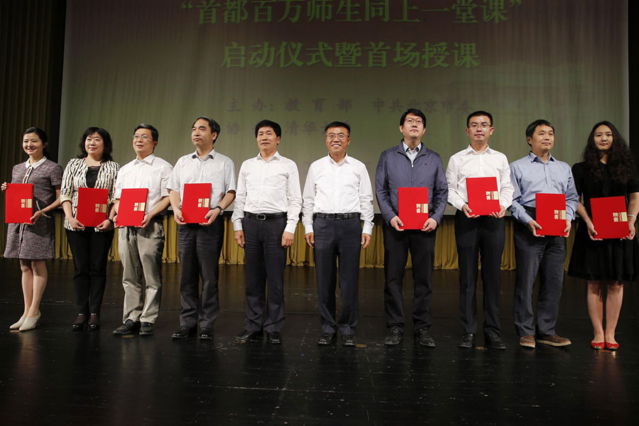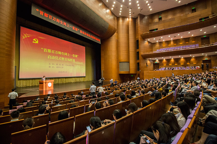 1/0“首都百萬師生同上一堂課活動”在清華大學(xué)新清華學(xué)堂拉開序幕。5月23日上午,在清華大學(xué)新清華學(xué)堂,教育部社會科學(xué)委員會副主任委員顧海良、清華大學(xué)校長邱勇,圍繞習(xí)近平總書記在北京大學(xué)師生座談會和紀念馬克思誕辰200周年大會上的重要講話精神,分別以“堅持正確辦學(xué)方向和加強馬克思主義理論學(xué)習(xí)研究宣傳”和“立德樹人,培養(yǎng)德智體美全面發(fā)展的社會主義建設(shè)者和接班人”為題,為1000余名首都高校部分干部教師代表做了精彩的授課。該場授課正式拉開了“首都百萬師生同上一堂課活動”的序幕。教育部黨組成員、部長助理劉大為,北京市委常委、宣傳部部長杜飛進出席。(許孟楠/攝)
