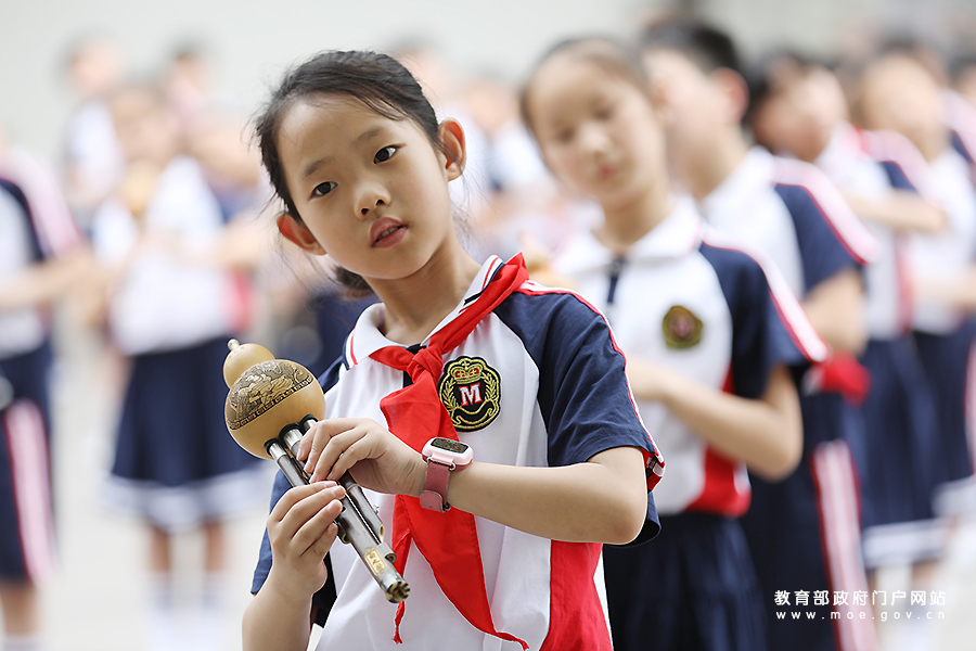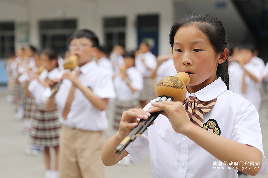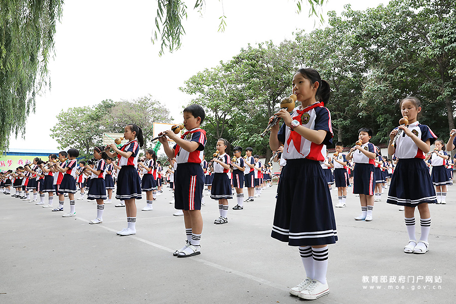 1/0河南省溫縣第二實(shí)驗(yàn)小學(xué)學(xué)生在校園里合奏葫蘆絲。(徐宏星/攝)