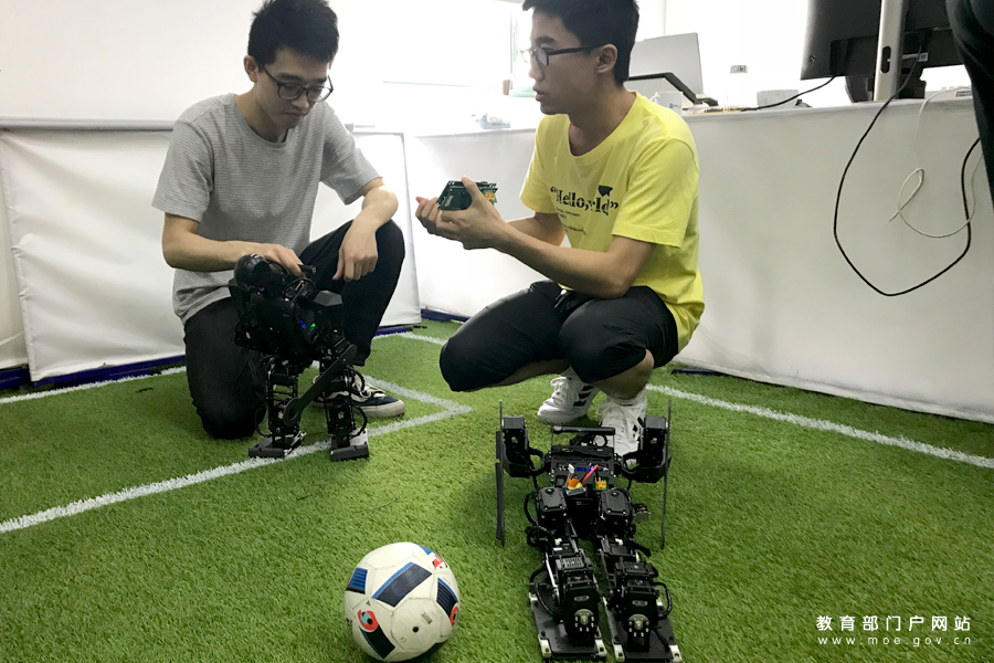 1/0浙江大學(xué)玉泉校區(qū)印刷廠訓(xùn)練室,機(jī)械電子與工程專(zhuān)業(yè)的學(xué)生李誠(chéng)輝(左)和自動(dòng)化控制專(zhuān)業(yè)的學(xué)生姜朝峰(右),為進(jìn)一步觀察足球機(jī)器人的運(yùn)動(dòng)規(guī)劃和平衡控制能力,正在更換足球機(jī)器人的線(xiàn)路板。(謝沂楠/攝 姚振/文)