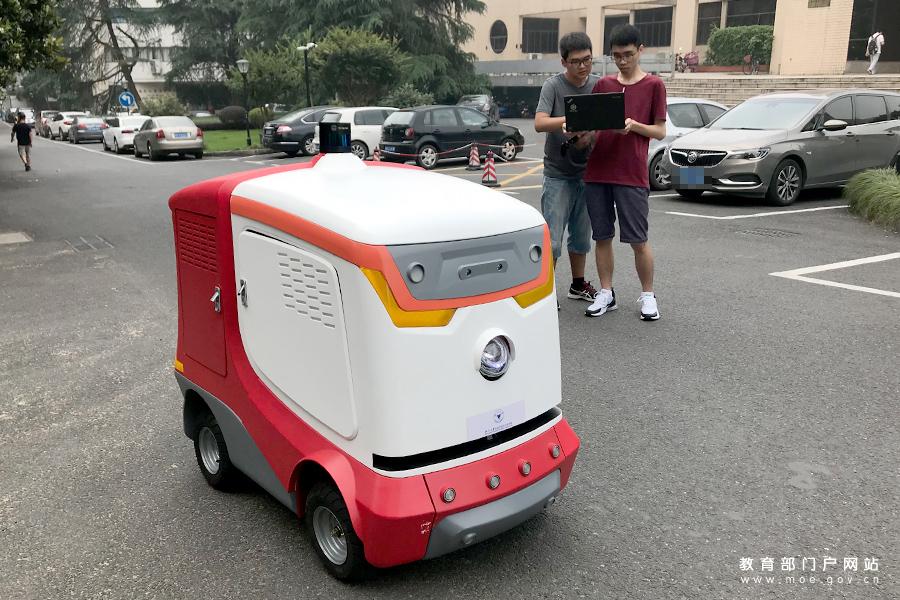 1/0浙江大學(xué)控制科學(xué)與工程學(xué)院的兩名學(xué)生正在操控物流機(jī)器人。(謝沂楠/攝 姚振/文)